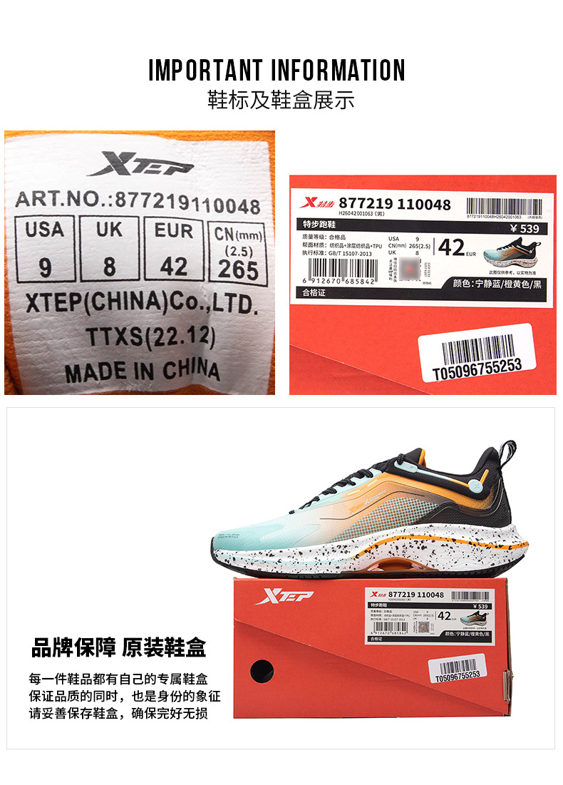 商品名称:特步 男 跑步鞋 877219110048宁静蓝/橙黄色/黑 39/40/41/42/43/4/45 下单备注颜色尺码
