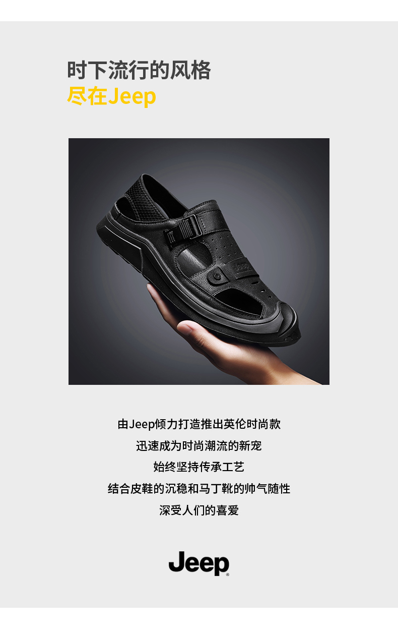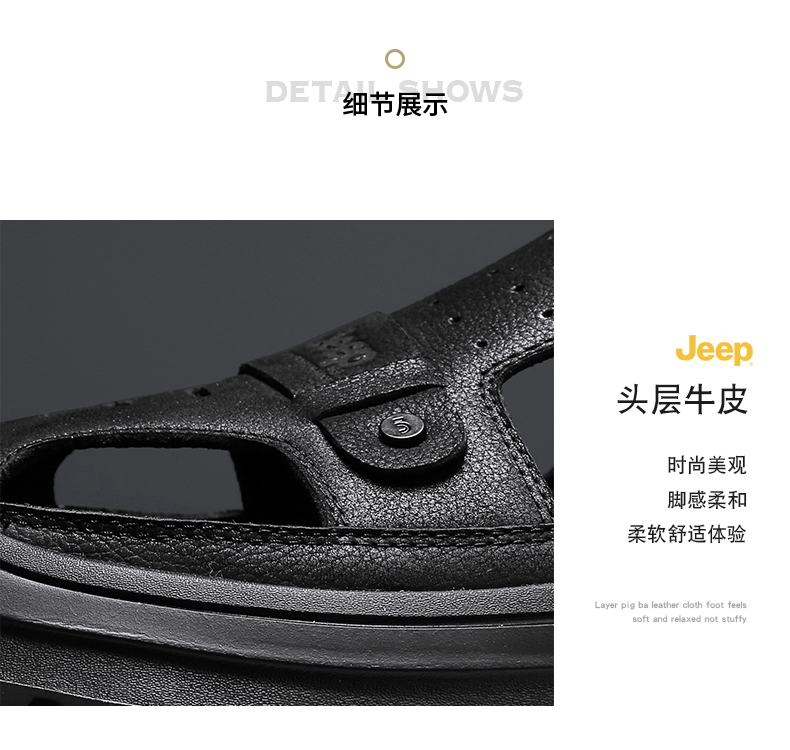 商品名称:JEEP沙滩鞋夏季真皮拖鞋开车休闲两用外穿运动包头凉鞋男 J121591545 黑色/黄棕 尺码39-44 下单请备注颜色尺码
