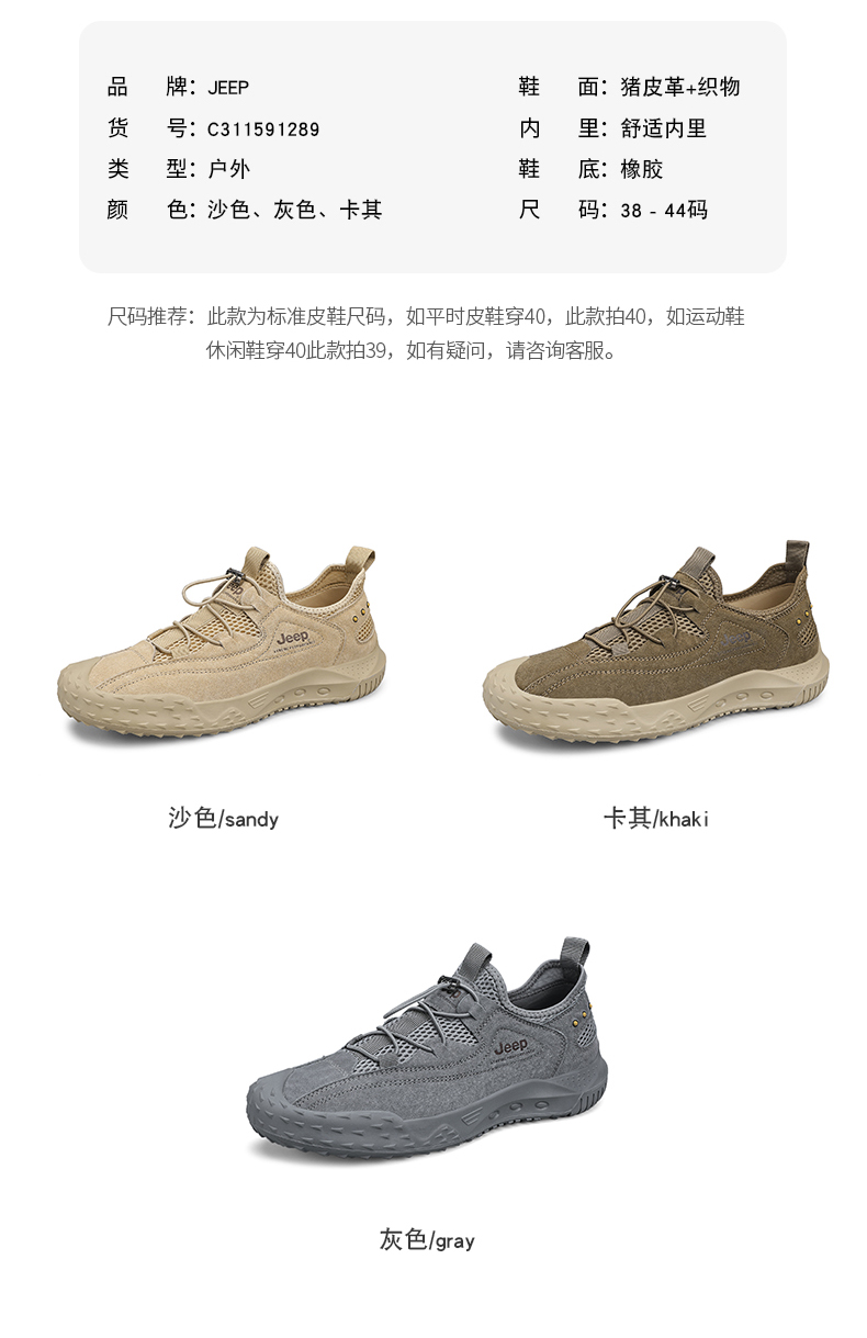 商品名称:JEEP吉普男鞋夏季户外登山软底运动鞋男士透气百搭休闲鞋 C311591289 沙色/灰色/卡其色 尺码38-44下单请备注颜色尺码