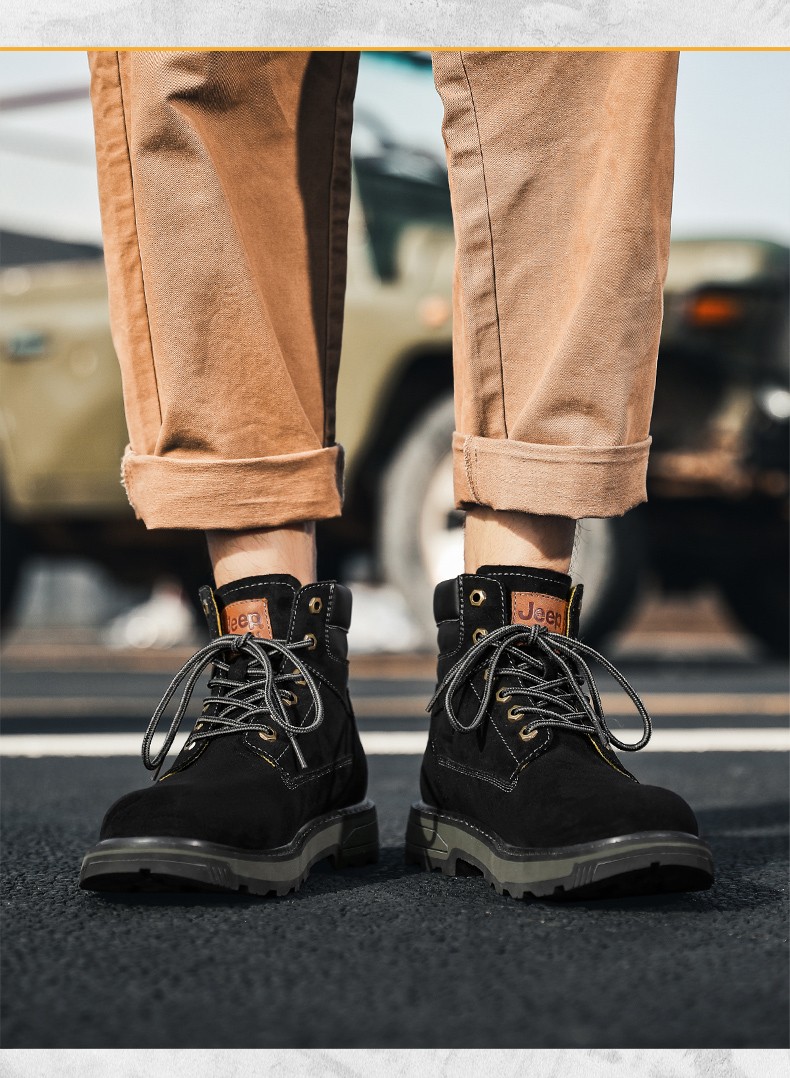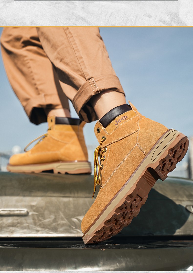 商品名称:JEEP吉普大黄靴男复古厚底高帮工装英伦马丁靴男士P214M08197 土黄色/黑色 尺码39-45 下单请备注颜色尺码