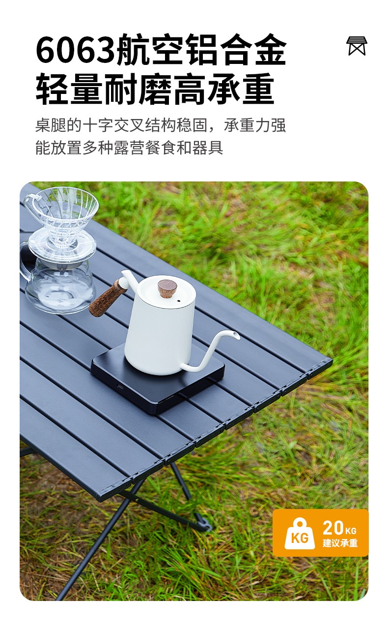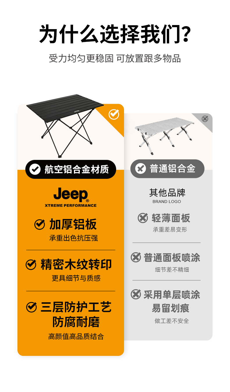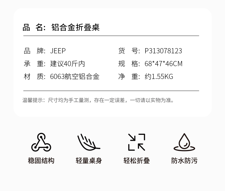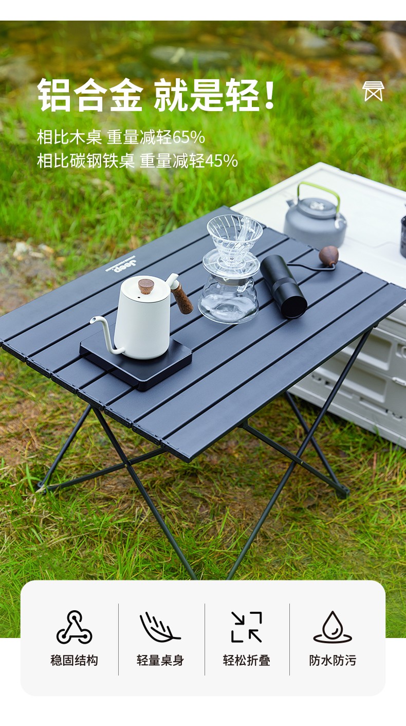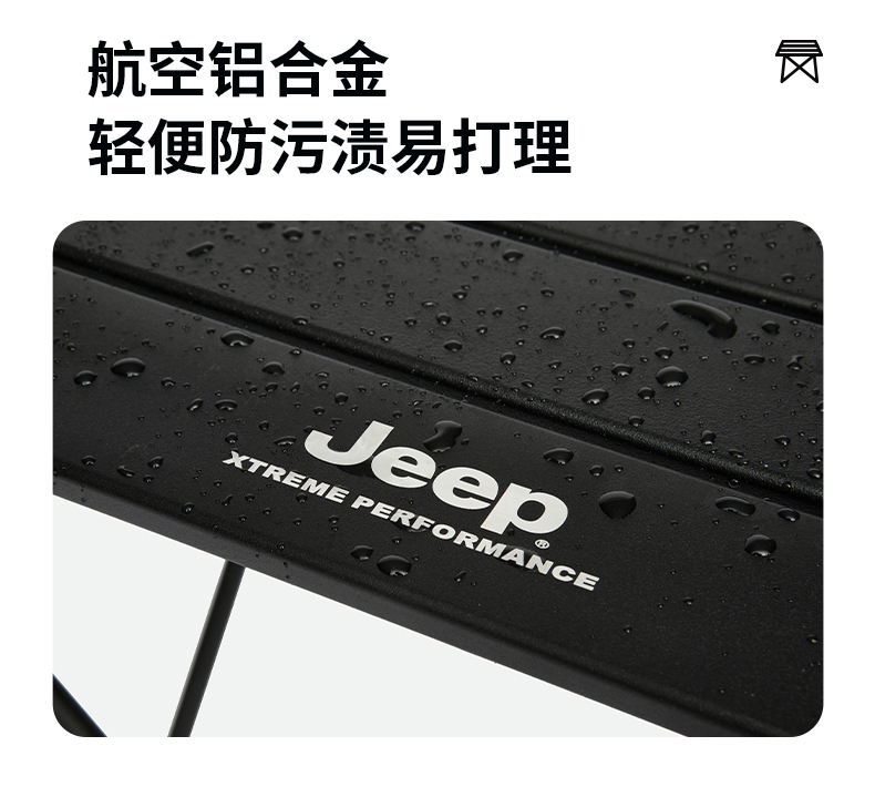 Jeep吉普户外露营野餐折叠桌可移动航空铝合金蛋卷桌便携式餐桌 P313078123 黑色 大号 68*47*46cm