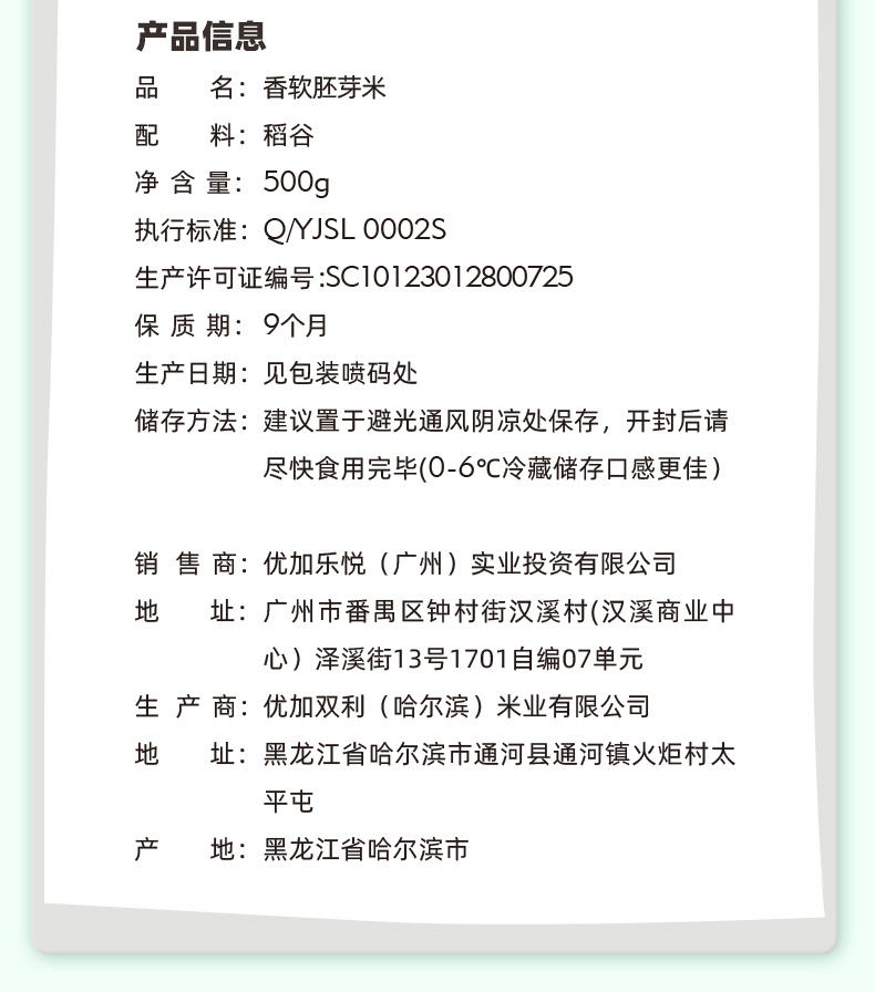 商品名称:芽芽乐 香软胚芽米500g*2盒装 6971530757150