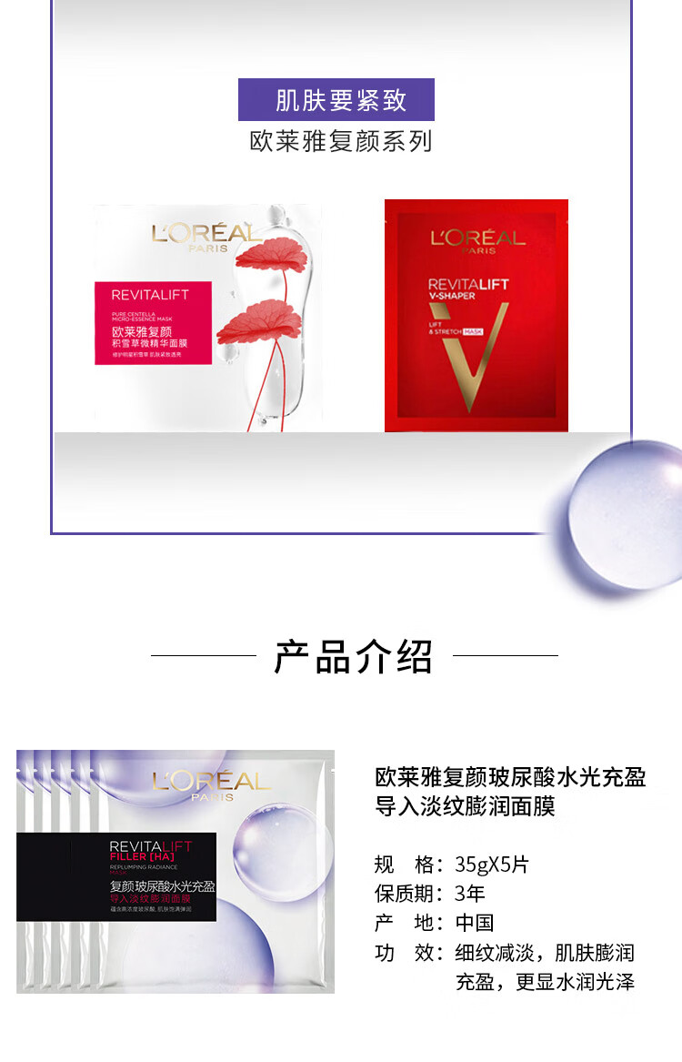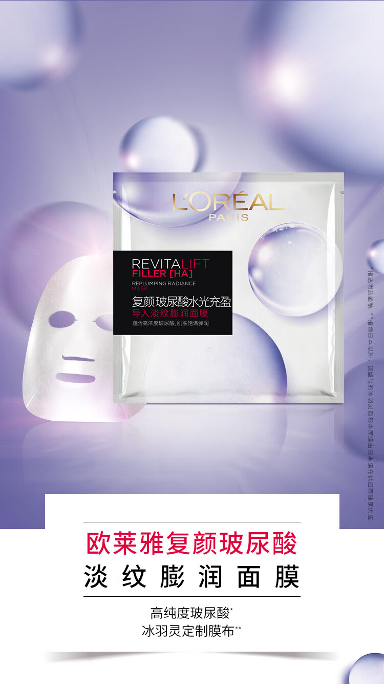 商品名称:欧莱雅复颜玻尿酸水光充盈导入淡纹膨润面膜 15片 6970175256509