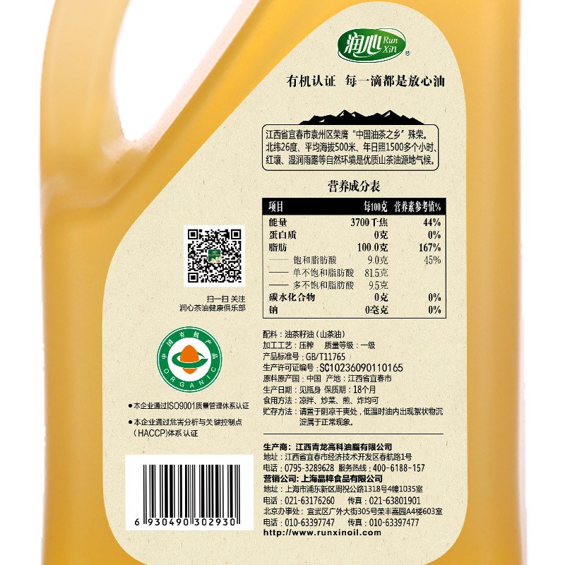 商品名称:润心山茶油 原香小榨 有机油茶籽油 低温压榨一级食用油5L 6930490302930