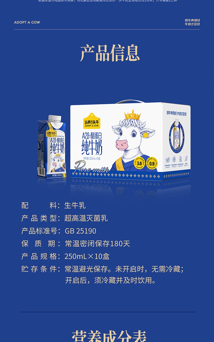 商品名称:认养一头牛250梦幻盖A2纯(3.6g)10入-一提装 1532469 69110101001293
