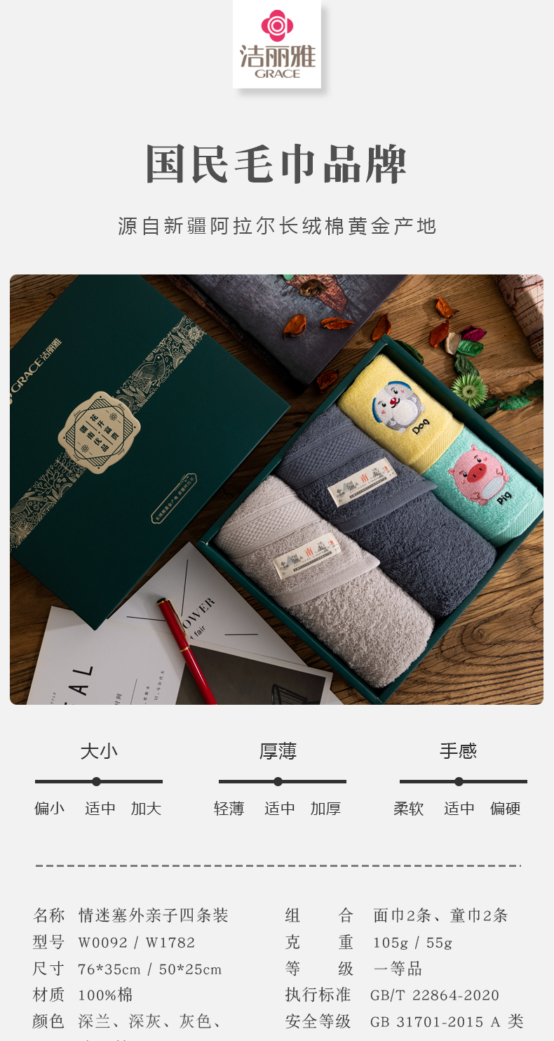 洁丽雅(GRACE)W0092+W1782情迷塞外亲子毛巾四条装 6925954441324 /6925954481597 颜色随机发