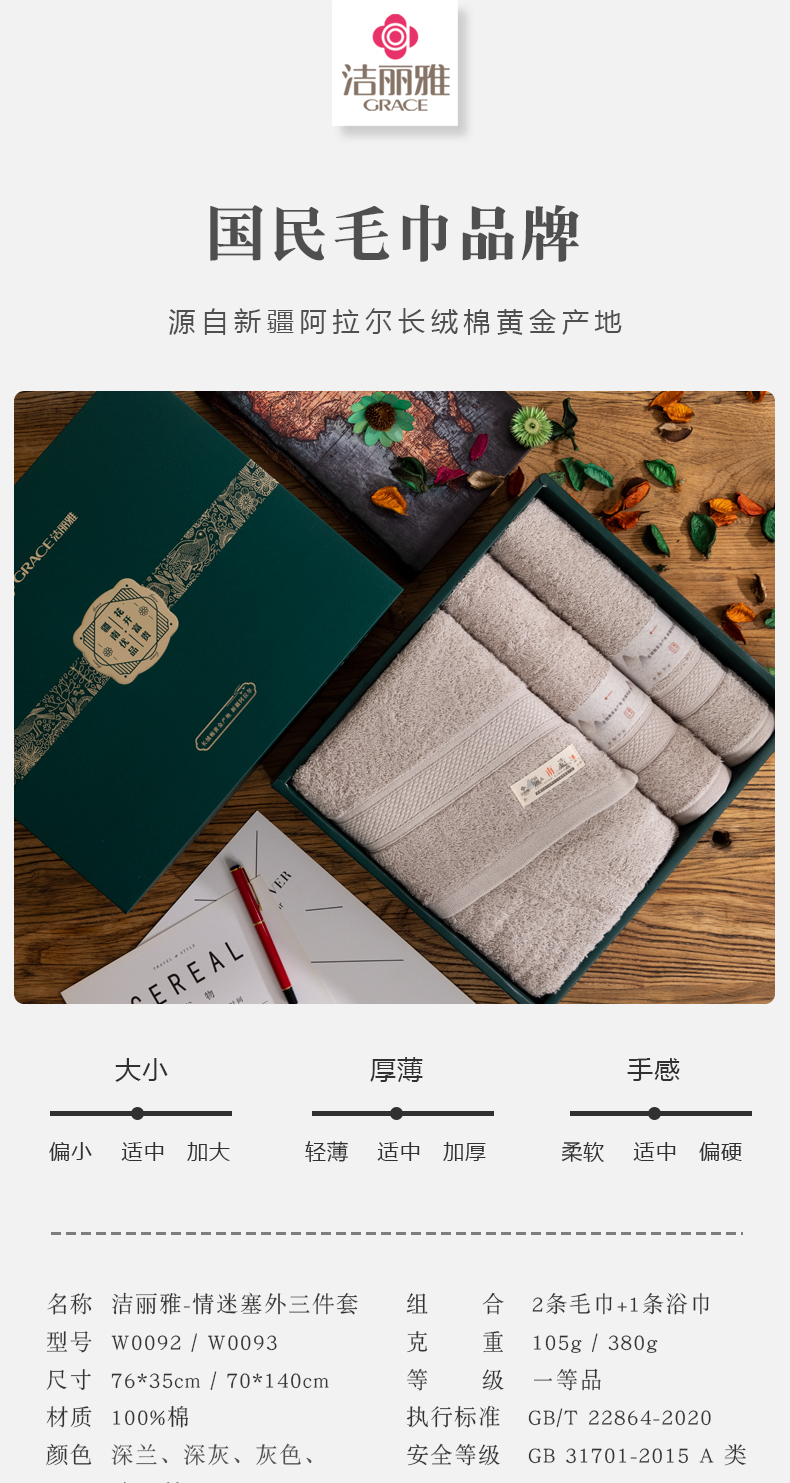 洁丽雅(GRACE)W0092+W0093情迷塞外浴巾毛巾三件套 6925954441324/ 6925954430908 颜色随机发