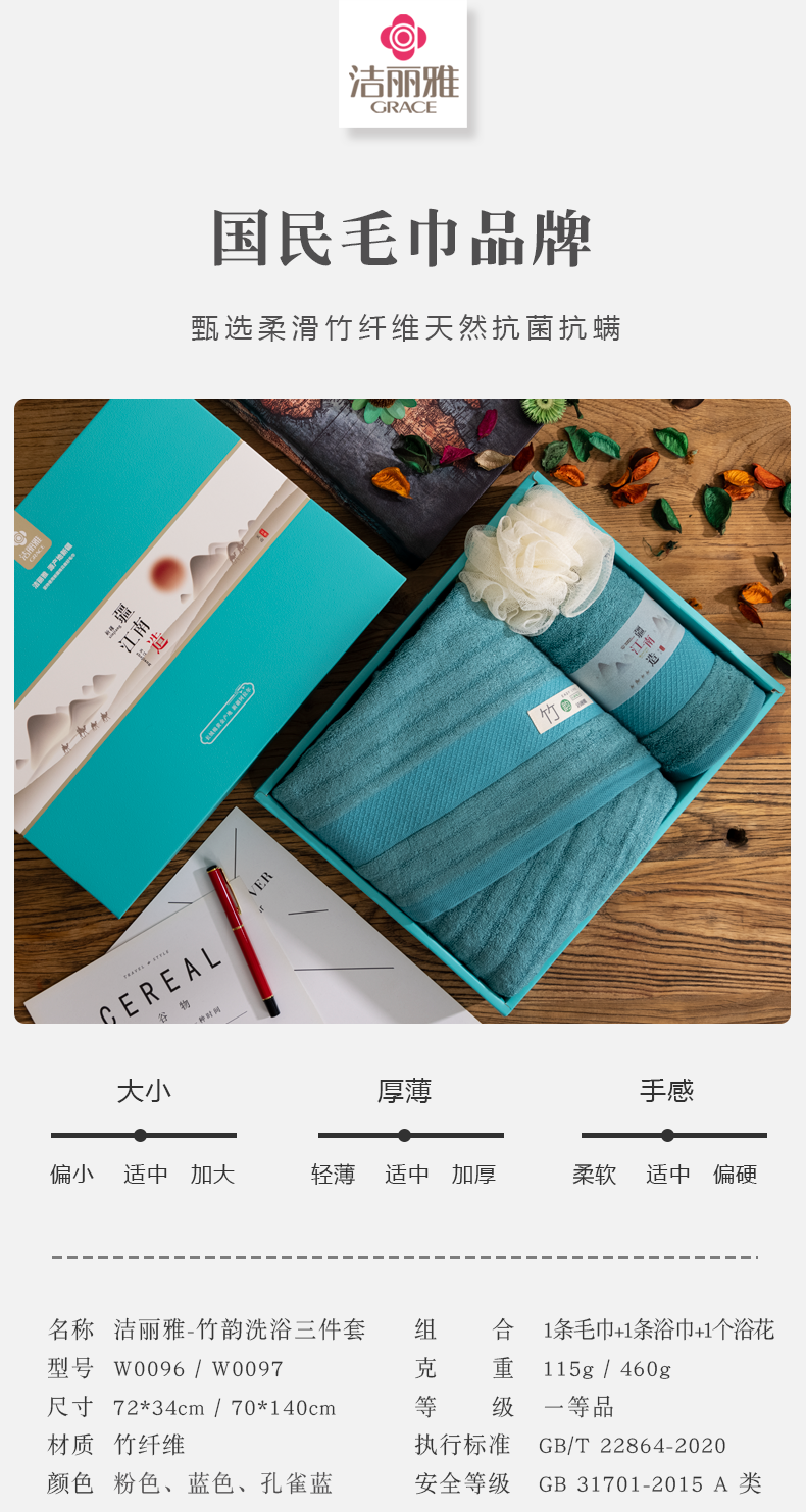 商品名称:洁丽雅(GRACE)W0096+W0097竹韵洗浴毛巾三件套 6925954430991/ 6925954431004 颜色随机发