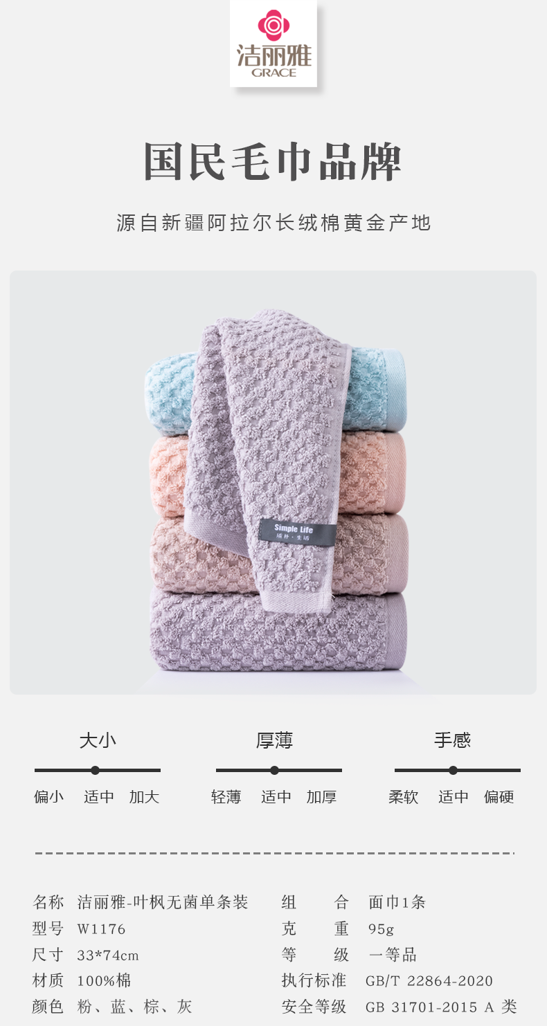 洁丽雅(GRACE)W1176叶枫无菌袋单条毛巾装 33*74cm 6925954494733 颜色随机发