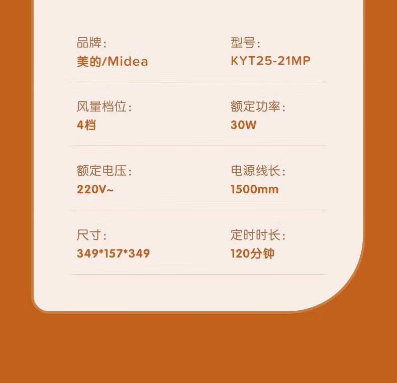 商品名称:美的(Midea)转页扇KYT25-21MP 10寸 暖光橙6939924839202