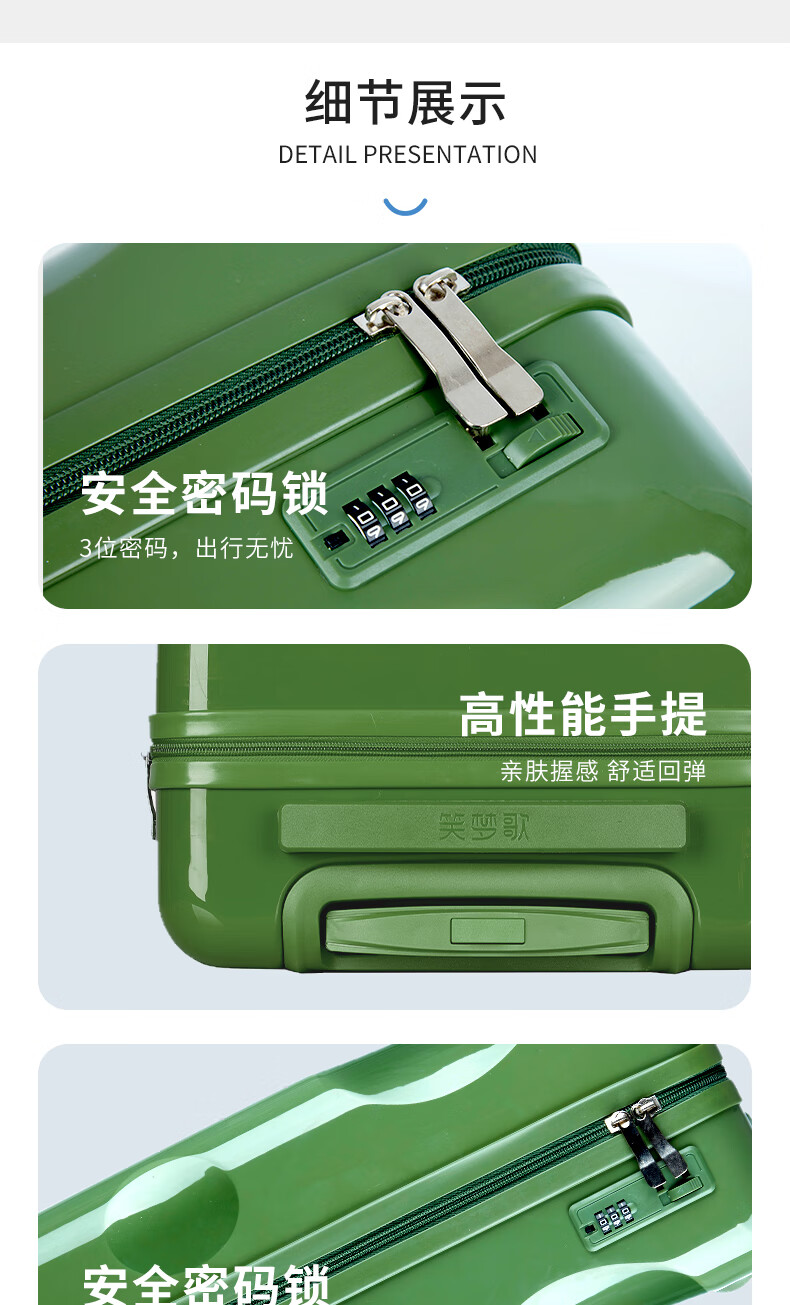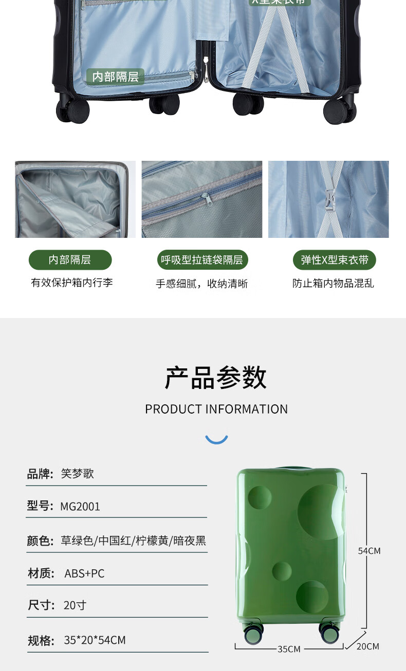 商品名称:笑梦歌月球坑青春行李箱 MG2001 20寸 草绿色/中国红/柠檬黄/暗夜黑可选 下单备注颜色