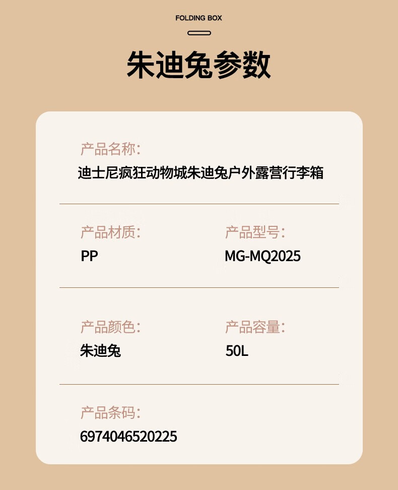 商品名称:笑梦歌迪士尼疯狂动物城朱迪兔户外露营行李箱 50L MG-MQ2025 朱迪兔