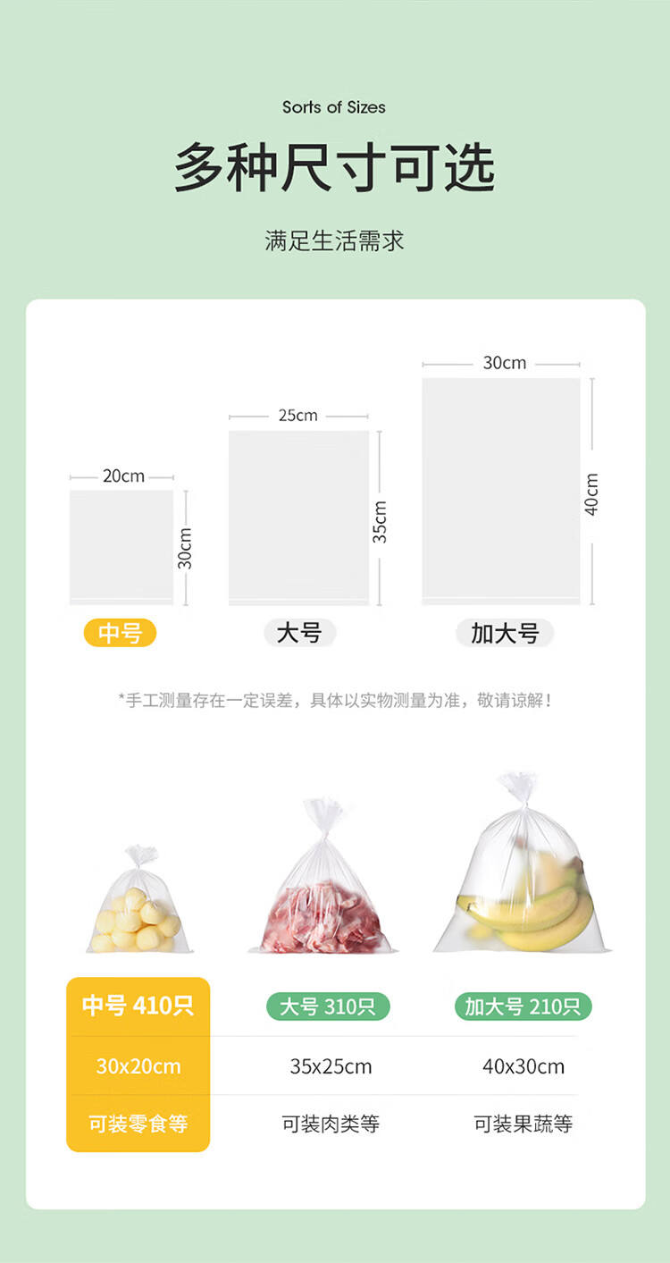 商品名称:美丽雅 抗菌保鲜袋食品级410只中号30*20cm 91337