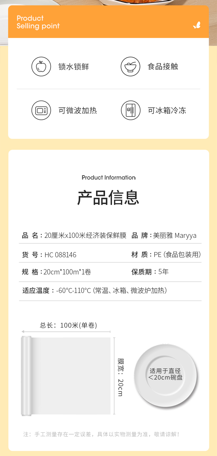 商品名称:美丽雅 一次性保鲜膜经济装20厘米x100米 88146