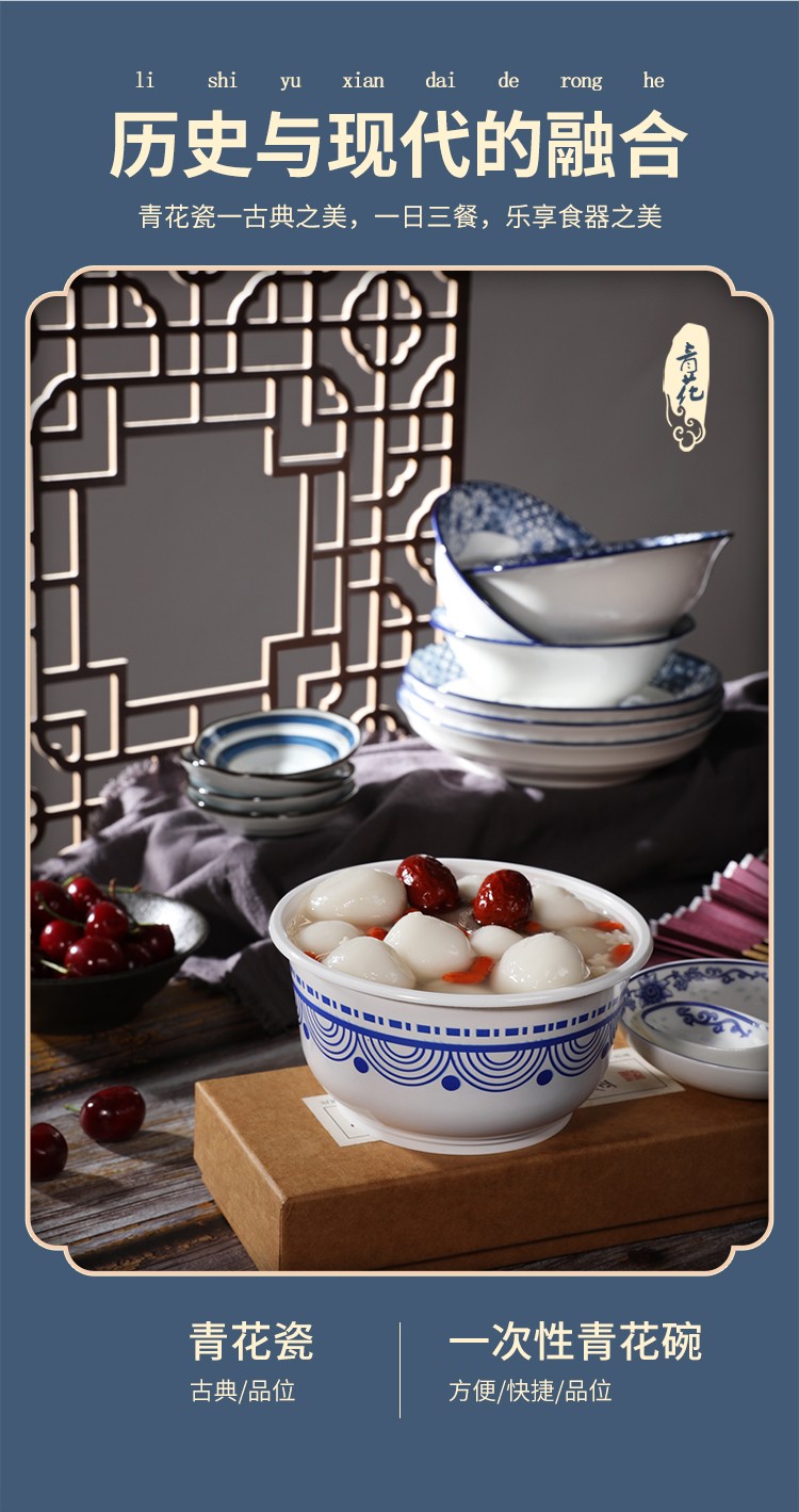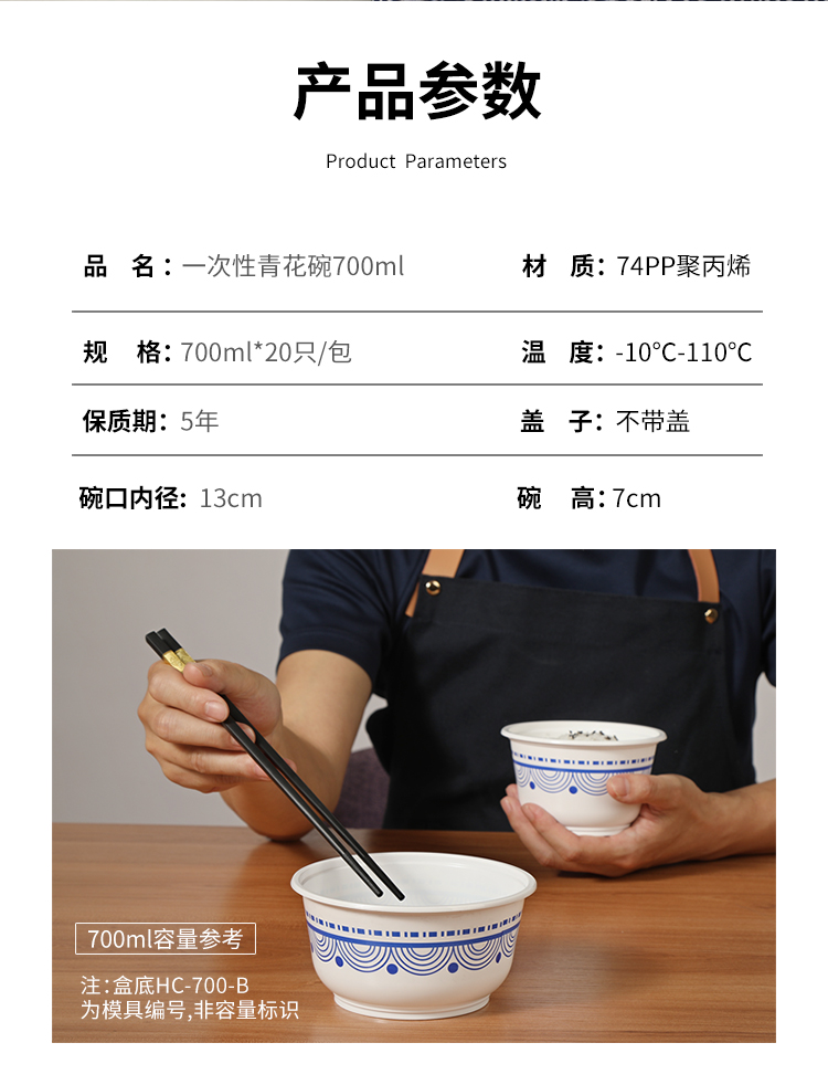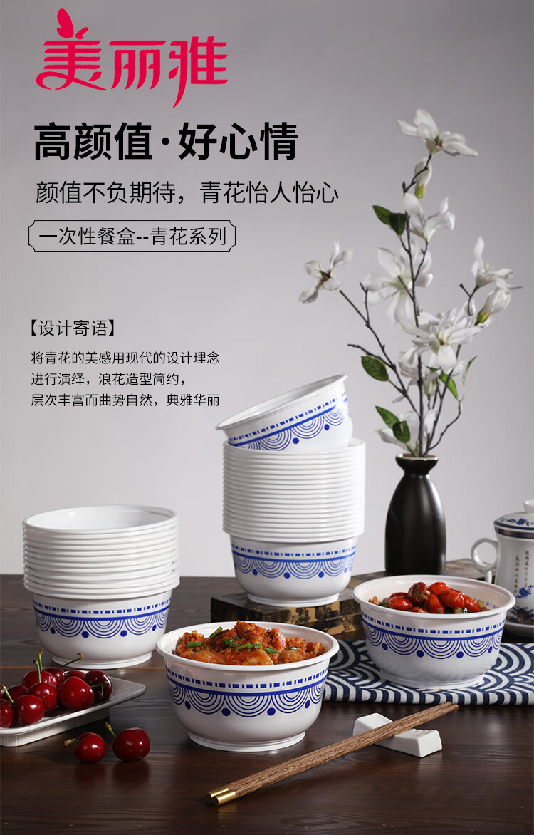 商品名称:美丽雅 一次性碗青花餐盒700ml*20只 大号食品级塑料饭碗86777