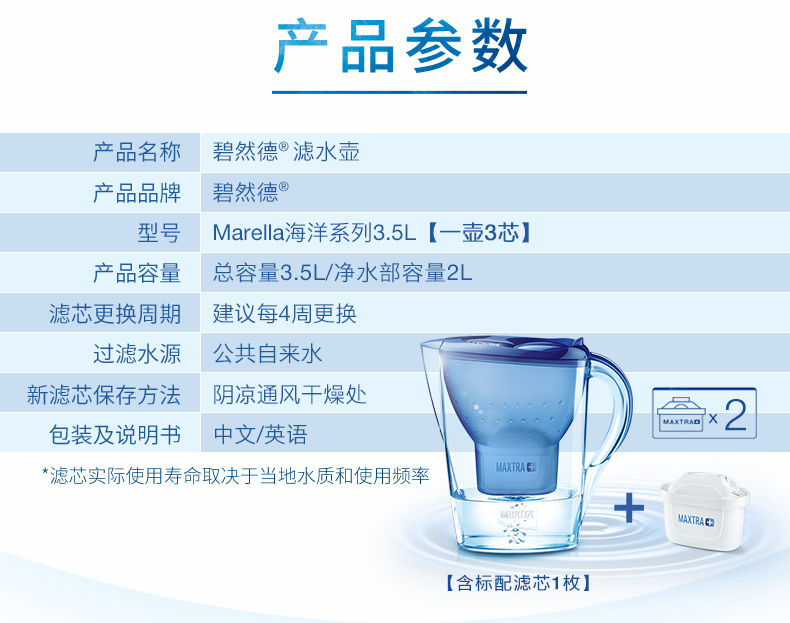 商品名称:碧然德 滤水壶海洋系列3.5L装 1壶2芯 蓝色 可选下单备注颜色