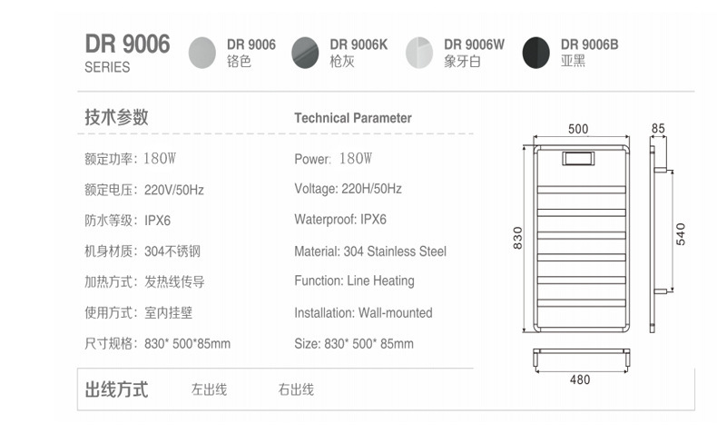 商品名称:凯勒电热毛巾架DR9006B 亚黑 830*50*85mm 左线/右线 下单请备注出线方式