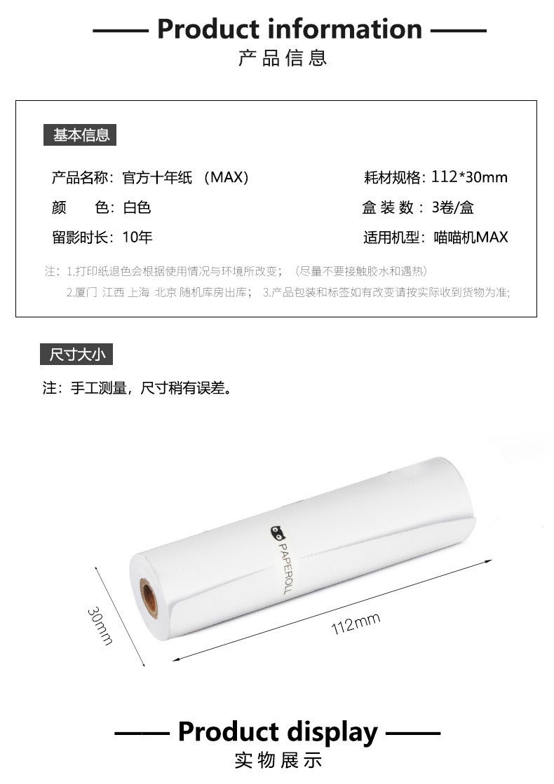 商品名称:喵喵机官方热敏纸十年纸1盒4寸 C1适合 10盒装