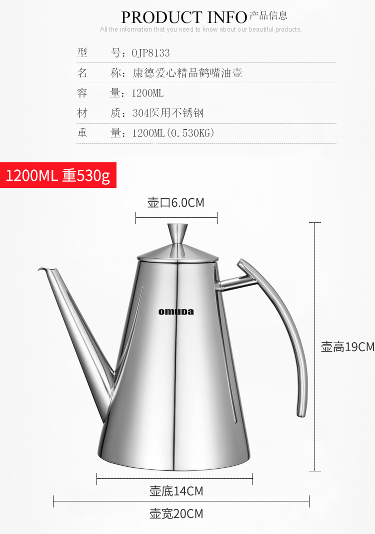 商品名称:欧美达 康德爱心精品鹤嘴油壶2#-1200ML OJP8133 6941334104900