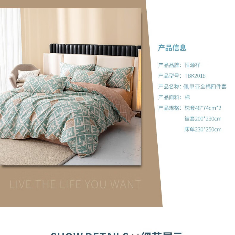 商品名称:恒源祥 佩里亚全棉四件套TBK2018 200*230cm 6941204363321