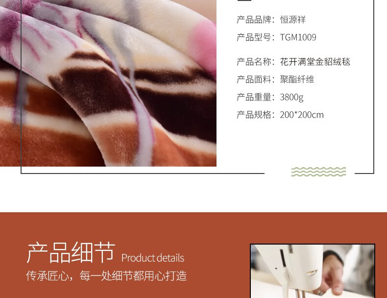商品名称:恒源祥 花开满堂金貂绒毯TGM1009 200*230cm 3800g 6941204315252