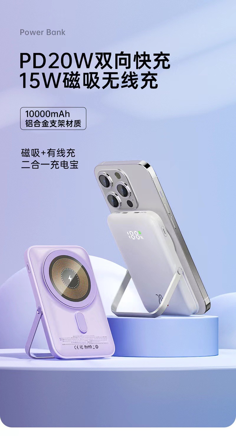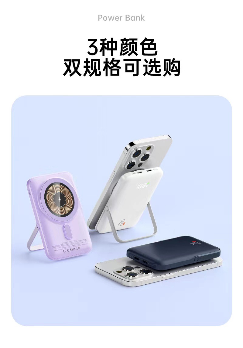 商品名称:ZHUMZO 支架磁吸充电宝W16 黑色/白色/紫色可选下单备注颜色