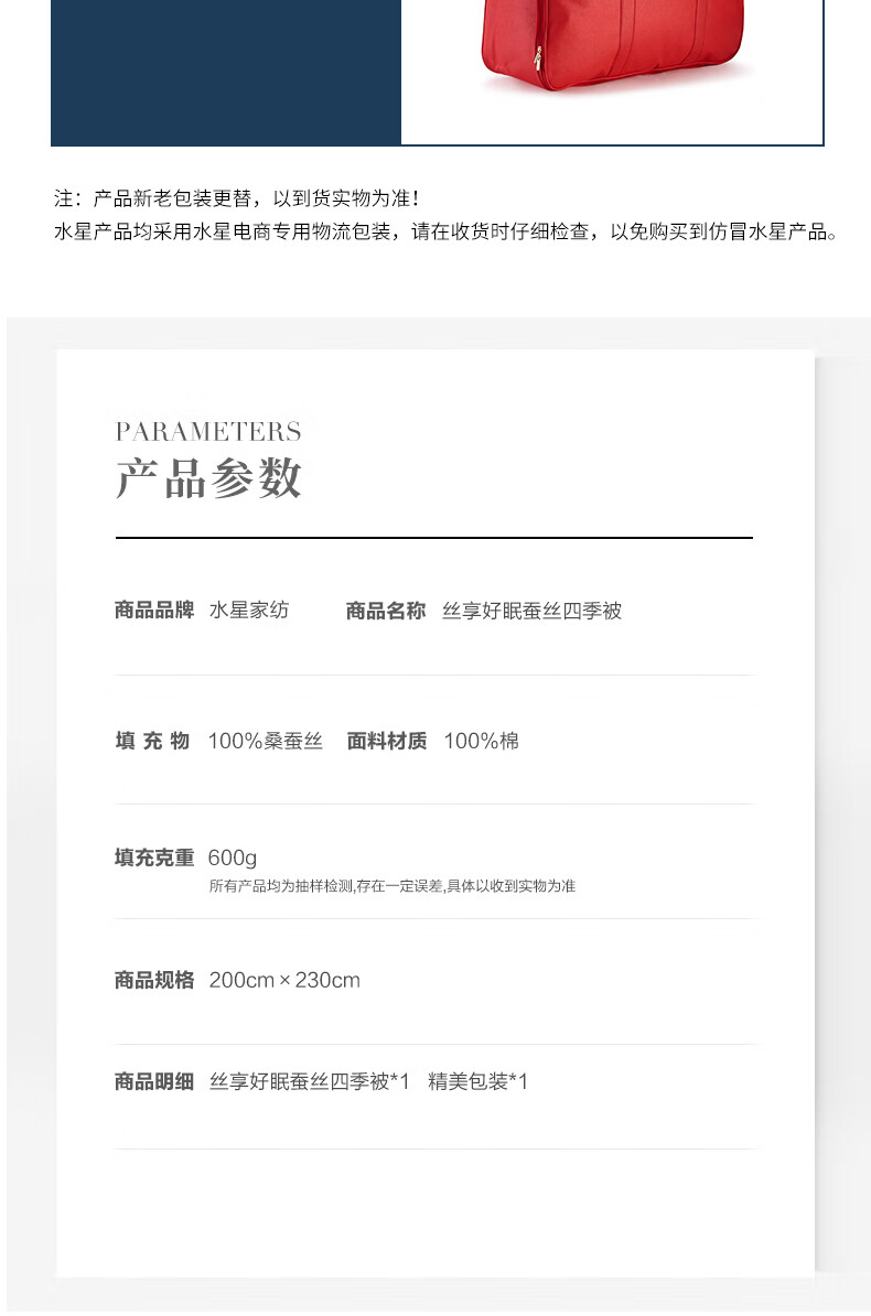 商品名称:水星家纺 丝享美眠蚕丝四季被600g 填充100%桑蚕丝 200×230cm 124434 /6942005906625