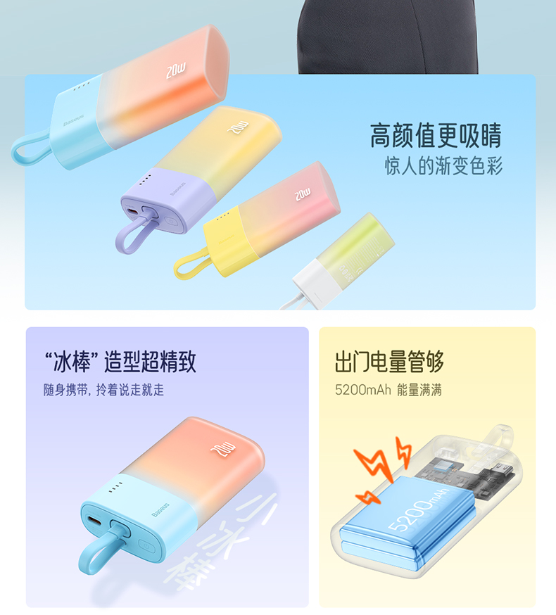 倍思 口袋快充 移动电源 IP 版 5200mAh 20W P10055600712-00赤霞橙/612-00冷松绿/Y12-00星灿黄/512-00星云紫可选下单备注颜色