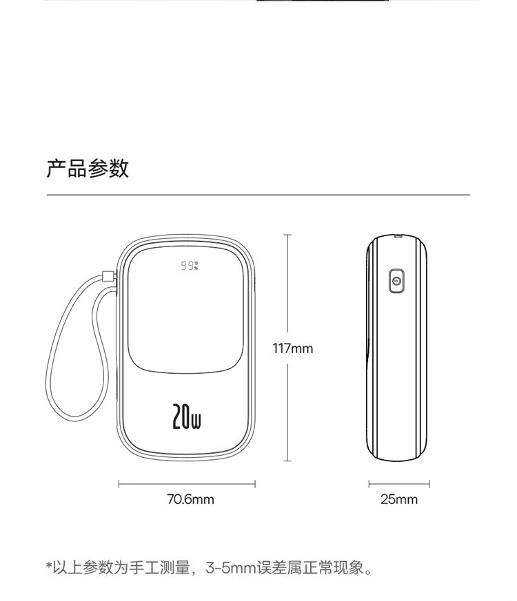 商品名称:倍思 Q电Pro 数显快充移动电源20W iP版 黑PPQD020001/白02/蓝03/紫05 可选下单备注颜色