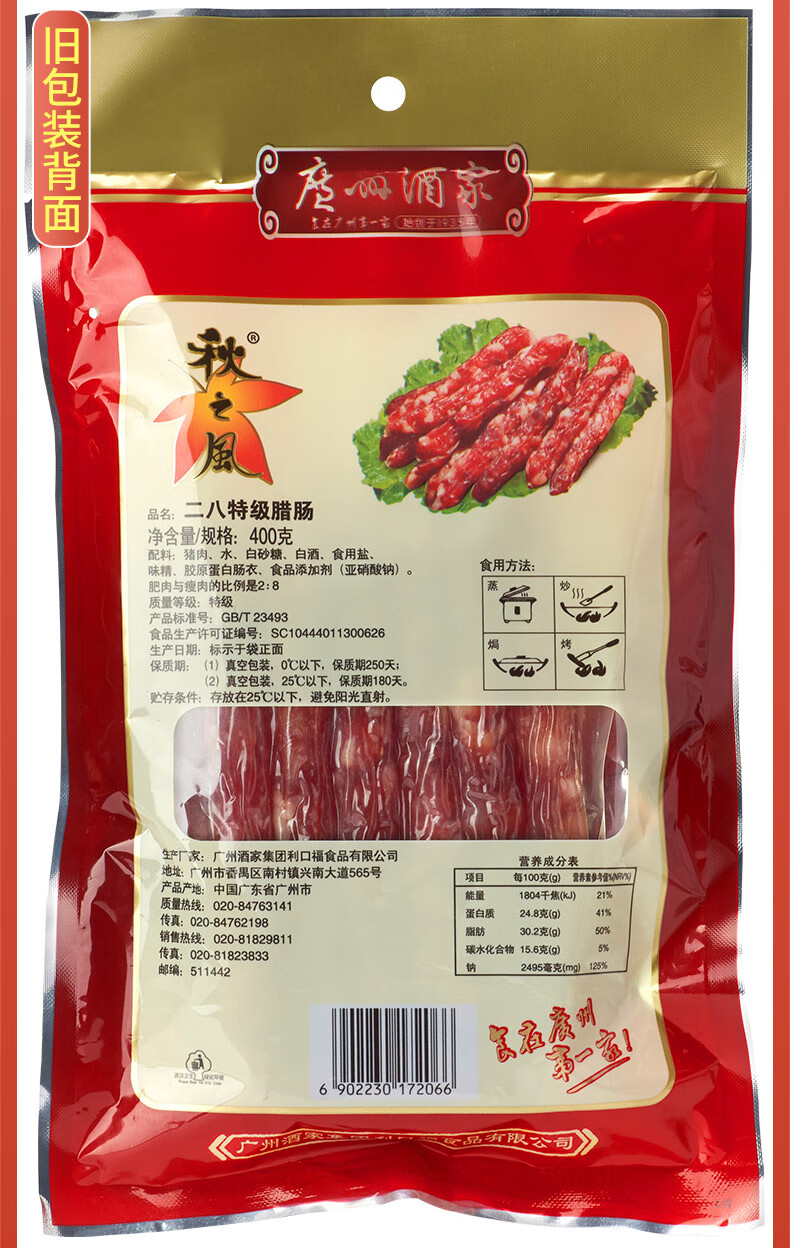 商品名称:广州酒家二八特级腊肠400g 6902230172066