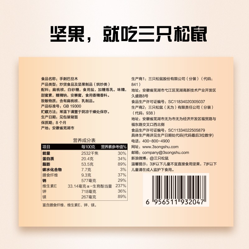 商品名称:三只松鼠 巴旦木185g 6956511932047
