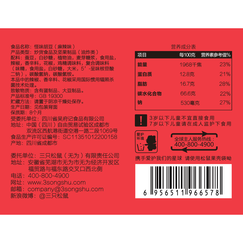 商品名称:三只松鼠 怪味胡豆110g*3 6956511966578
