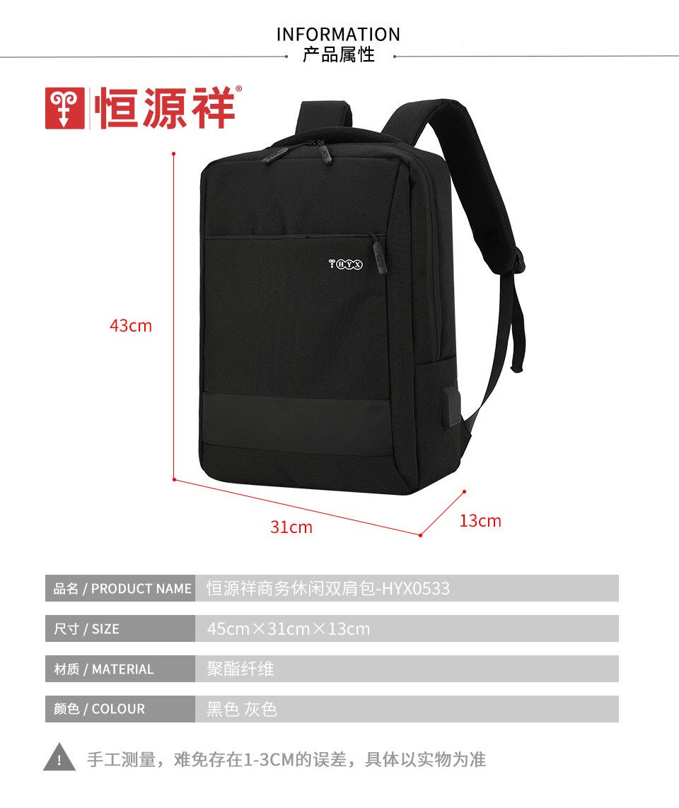 商品名称:恒源祥(HYX)笔记本电脑包 双肩背包 简约双肩包 15.6英寸商务休闲旅行包 型号0533 黑色