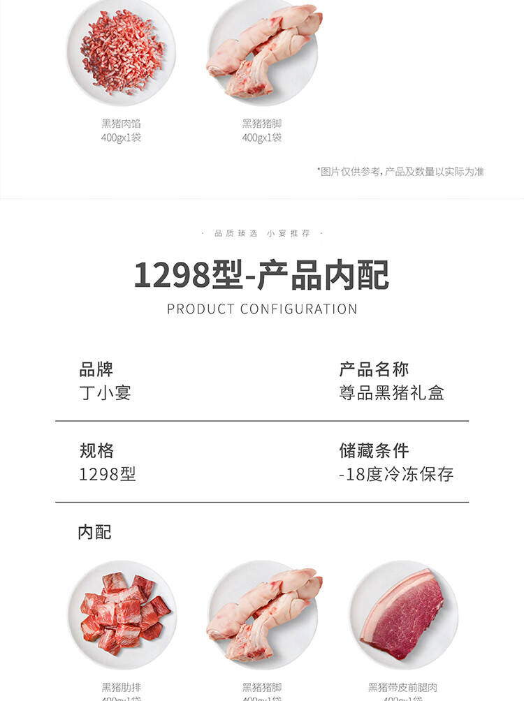 商品名称:丁小宴尊品黑猪礼盒商务团购送礼黑猪肉馅黑猪汤骨 尊品黑猪1098型*4500g 6975557501611