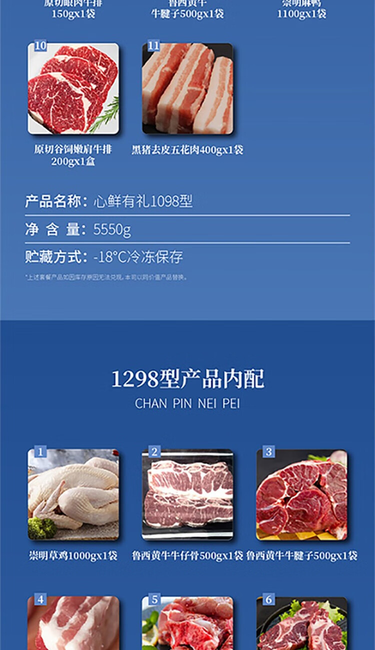商品名称:丁小宴混合生鲜礼盒锡盟羊肉鲁西黄牛黑猪崇明麻鸭崇明草鸡大礼包 心鲜有礼668型·3400g 6975557501734