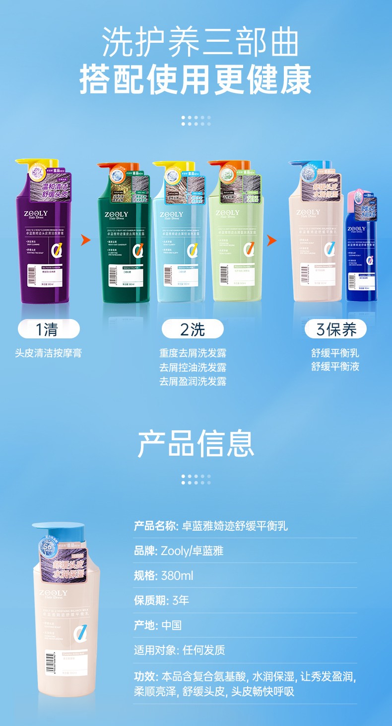 商品名称:卓蓝雅 婍迹舒缓平衡乳380ml 水润保湿 舒缓头皮