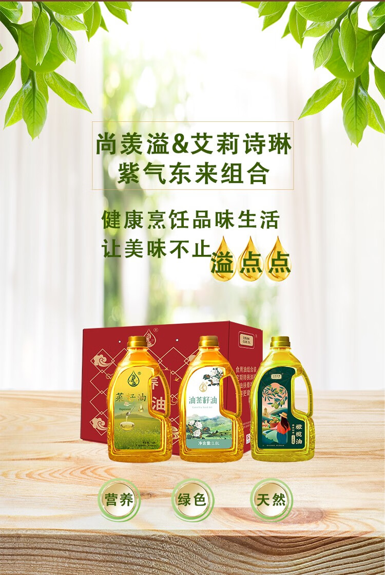 尚羡溢&艾莉诗琳 紫气东来组合油(尚羡溢菜籽油家庭装1800ml+尚羡溢油茶籽油家庭装1800ml+艾莉诗琳特级初榨橄榄油1800ml)