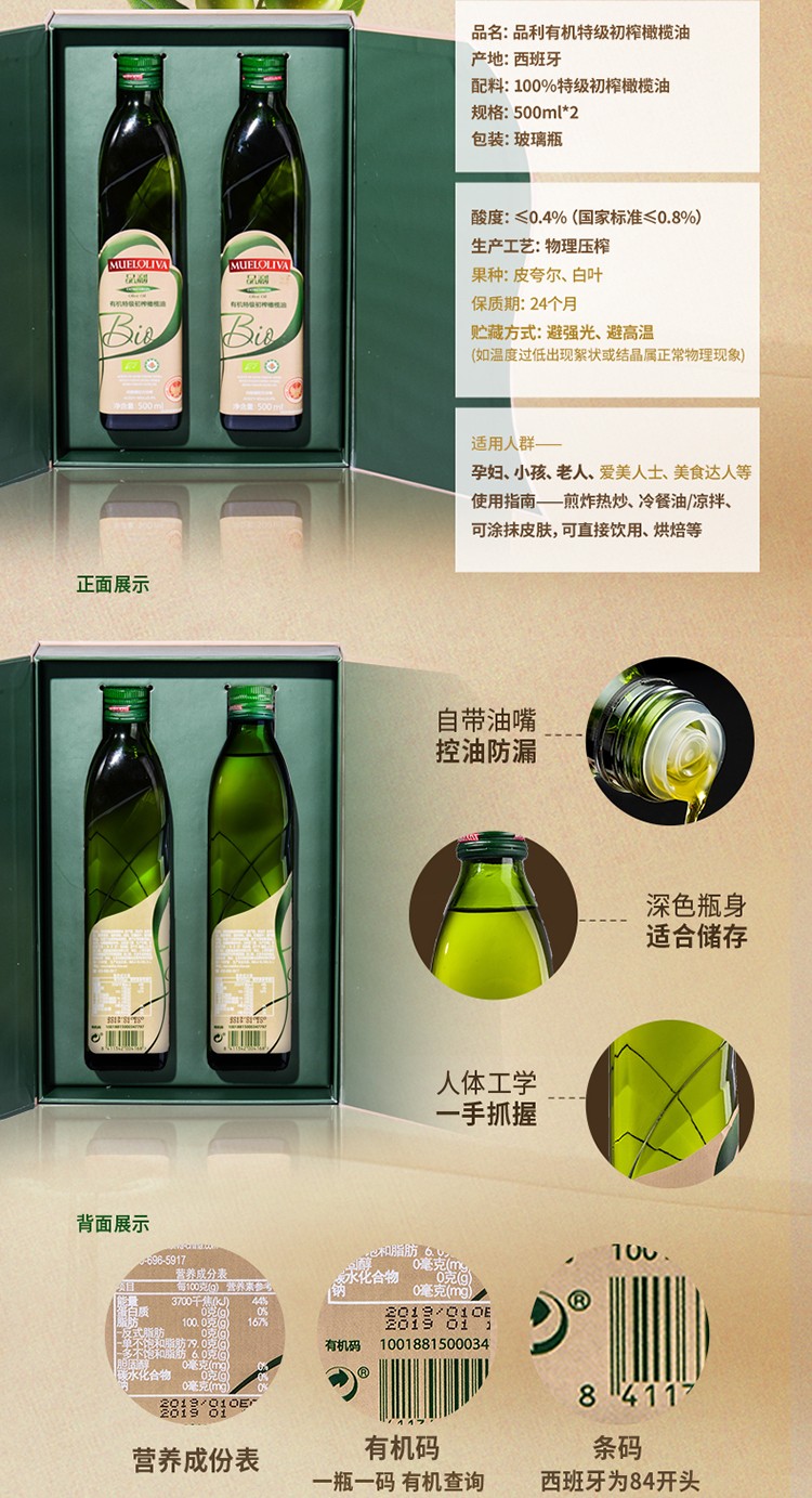 商品名称:品利 有机特级初榨橄榄油礼盒500ML*2 1100351