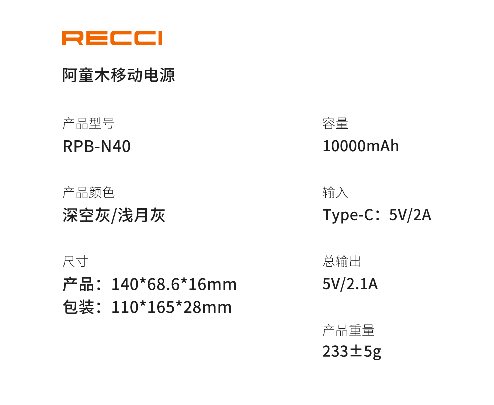 锐思RPB-N40 阿童木移动电源 深空灰/浅月灰 颜色可选 下单备注颜色 新疆西藏运费另算
