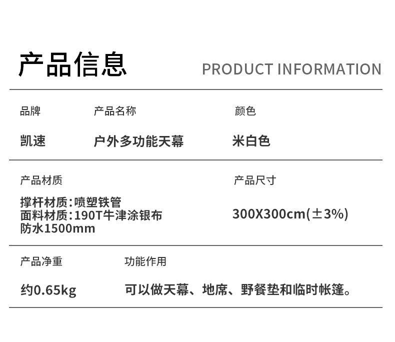 商品名称:凯速 户外多功能天幕MT01 米白色 6970997974377