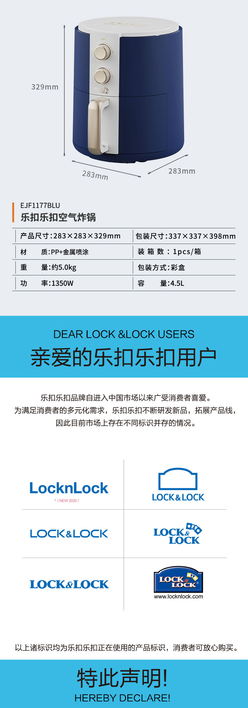 商品名称:乐扣乐扣 电烤炉(空气炸锅) EJF1177BLU 4.5L