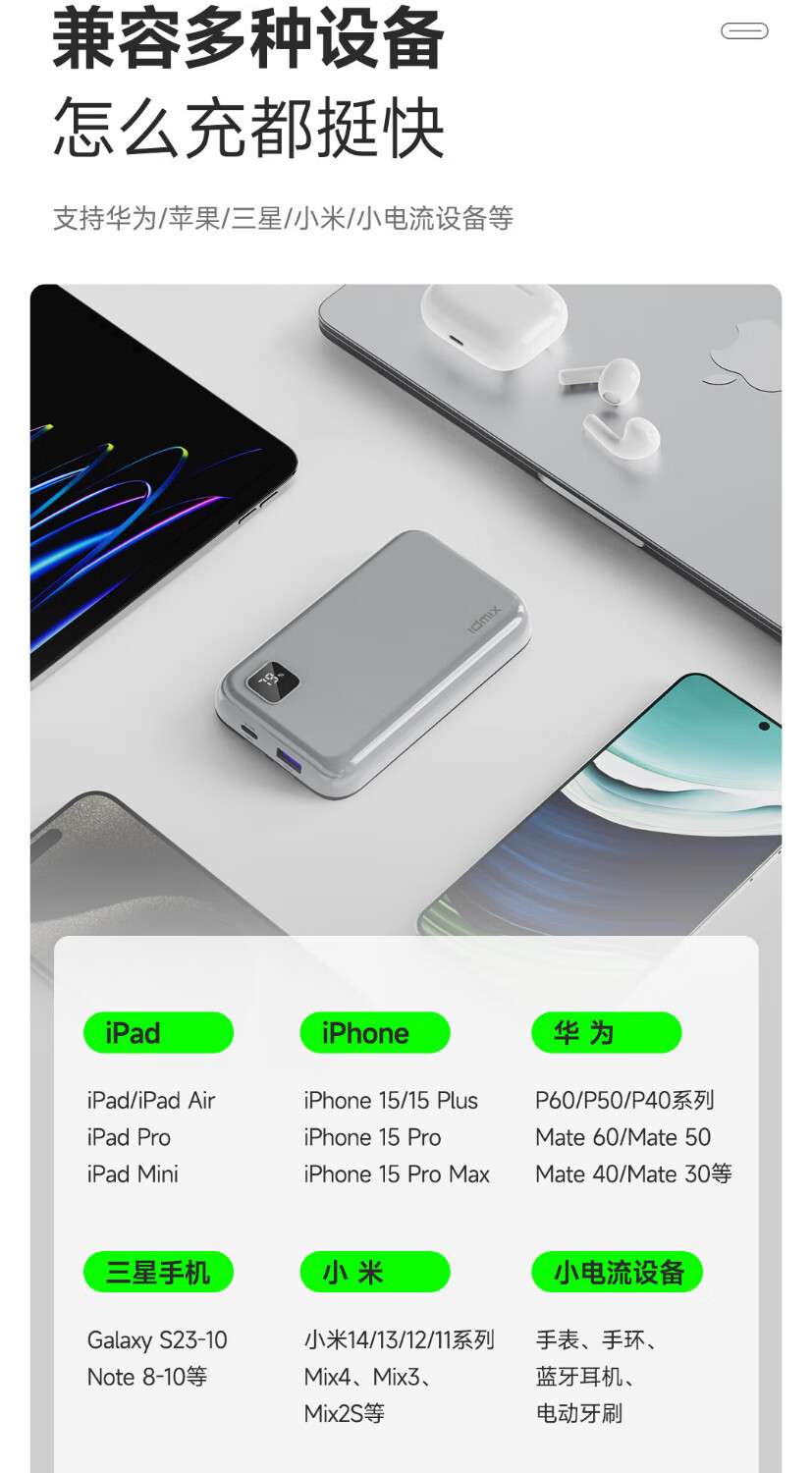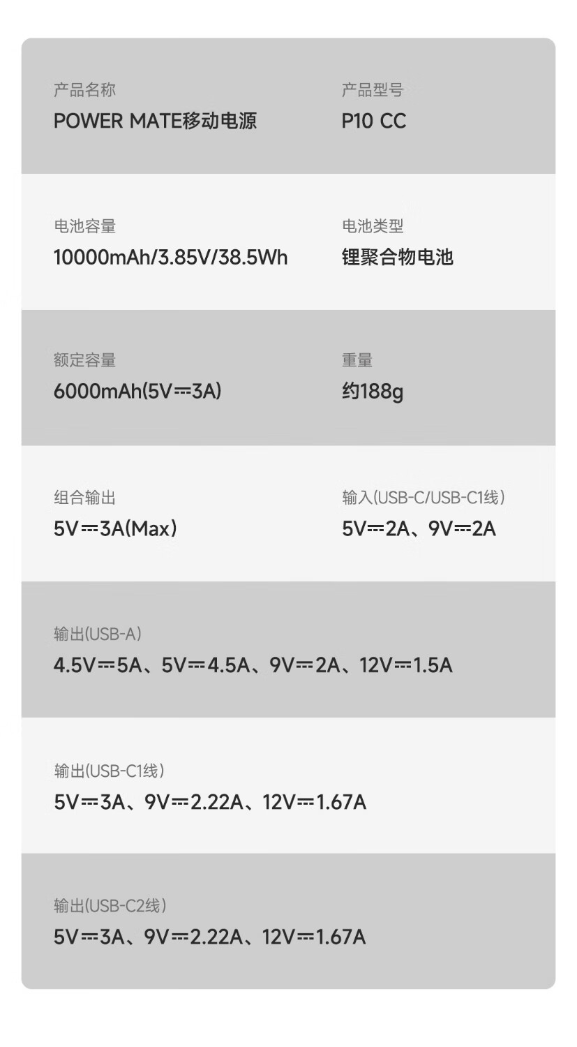 商品名称:大麦idmix 双自带线PD快充移动电源10000mAh P10CC