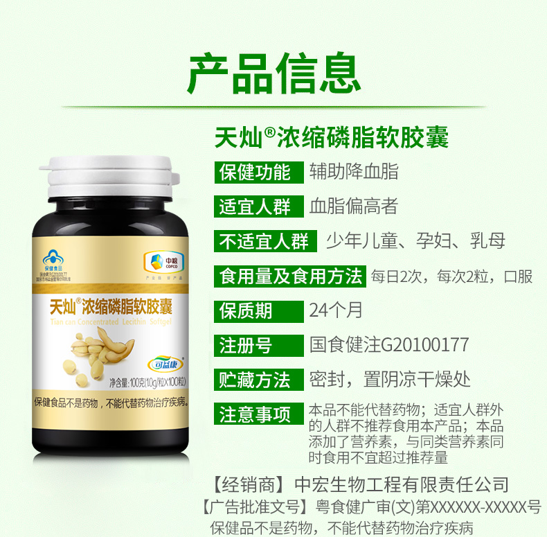 商品名称:中粮 可益康浓缩磷脂软胶囊100粒*1瓶 6924217139701