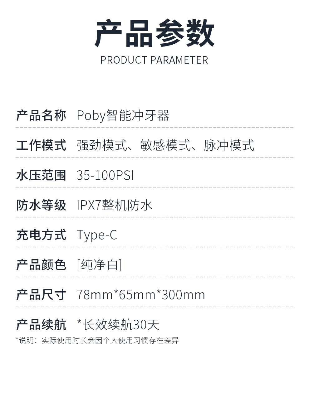 商品名称:Poby 小蛮腰冲牙器YPO0052 月光白6974601400337/水天蓝6974601400344下单备注颜色