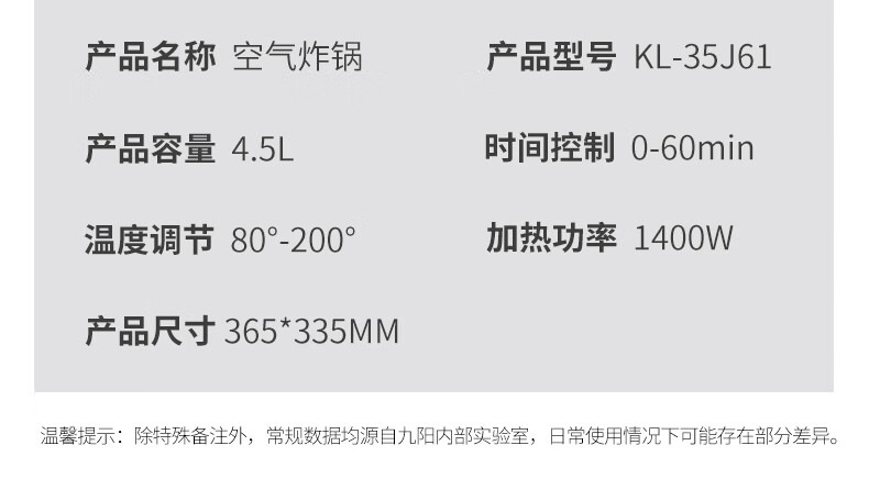 商品名称:九阳(Joyoung)空气炸锅大容量家用炸薯条机无油煎炸空气炸锅 KL35-J661【4.5L 双旋钮 绿色】6953349830804 新疆西藏内蒙青海宁夏不发货