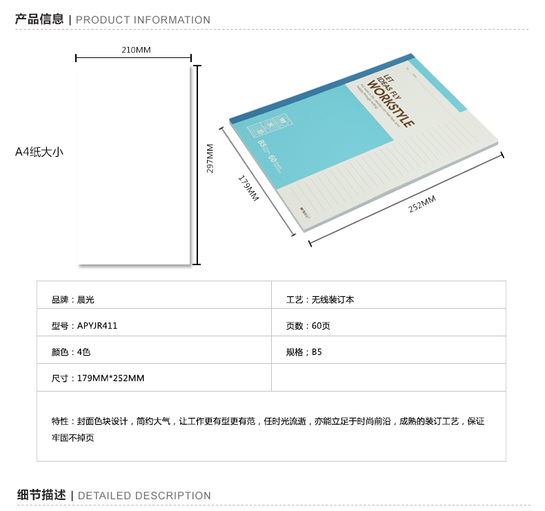 商品名称:晨光(M&G)APYJR411 B5无线装订本60页商务软抄记事本 办公学习用学生笔记本单线本8本装 6953787337507