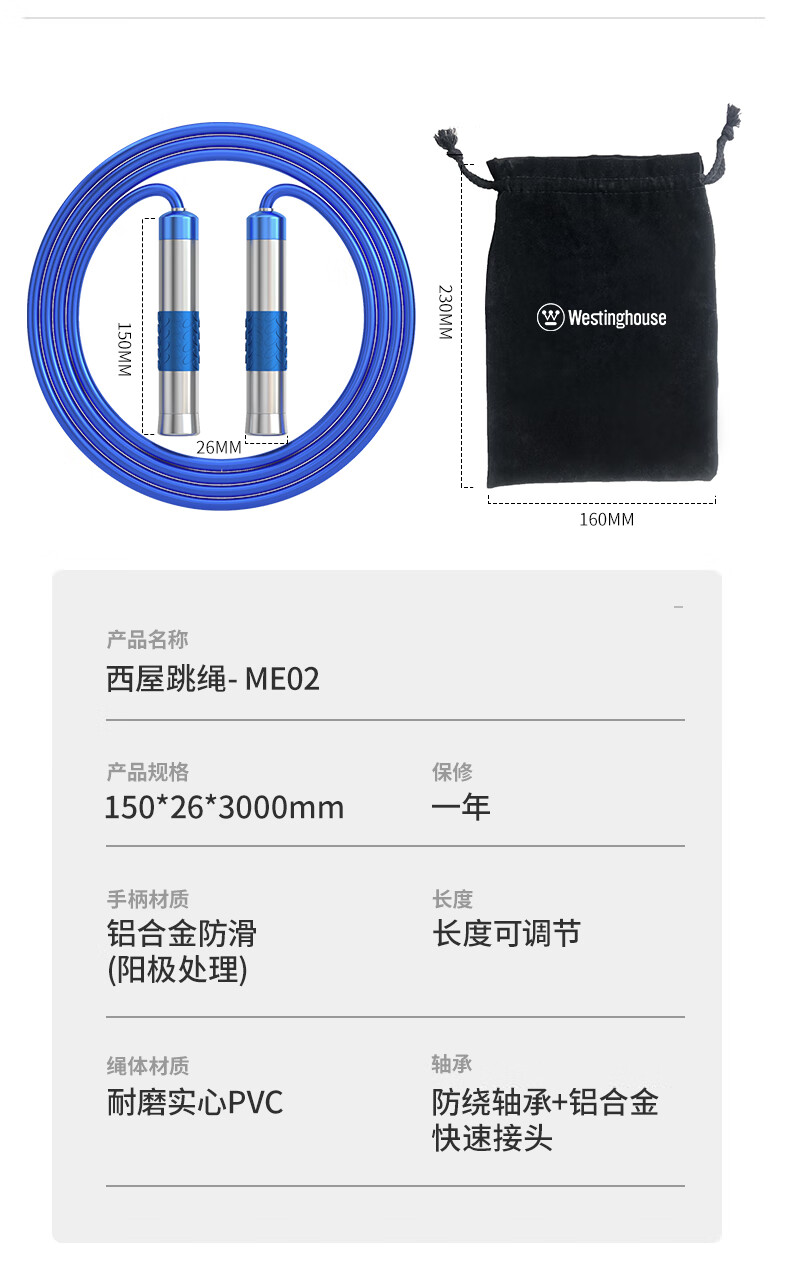 商品名称:西屋(Westinghouse) 跳绳成人钢丝中小学生中考竞速体育考试负重运动健身器材 ME01【专业竞速】 铝合金手柄