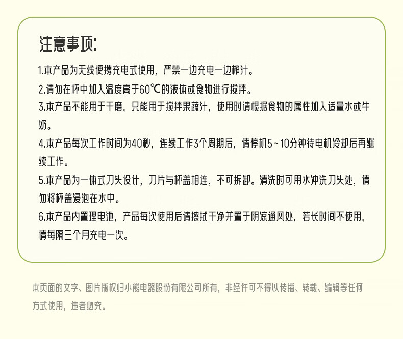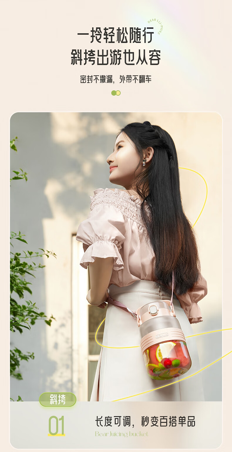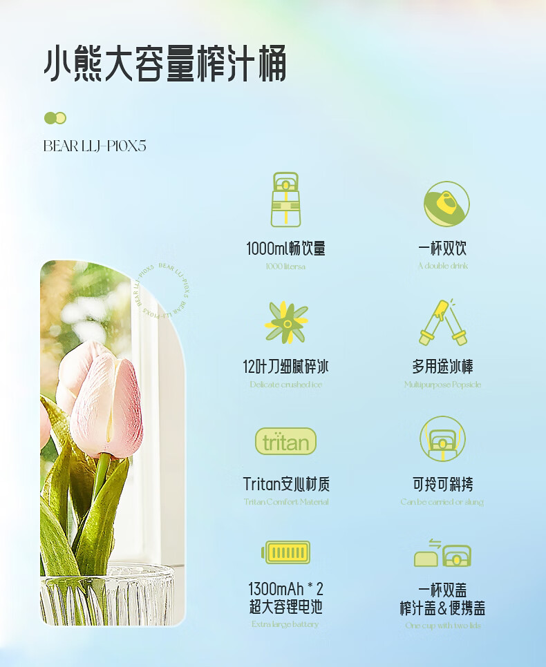 商品名称:小熊(Bear)榨汁机吨吨桶家用便携式榨汁杯无线充电果汁机户外随行杯果汁杯 12叶刀可碎冰榨汁桶LLJ-P10X5 1L容量 6940971256898