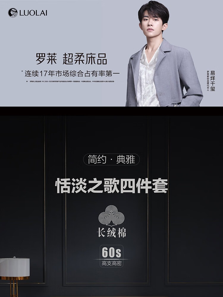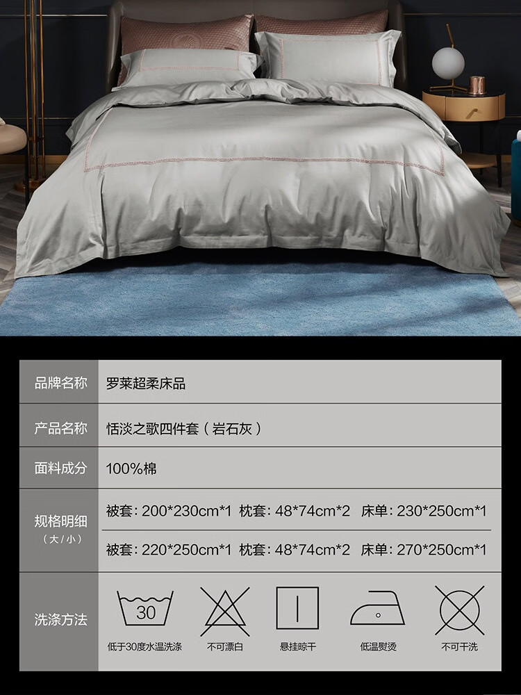 罗莱 恬淡之歌HB-L60S全棉贡缎四件套(灰)200*230cm 6901974096300