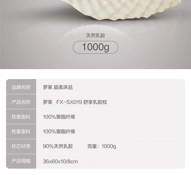 商品名称:罗莱 泰国甄享乳胶枕36*60*10/8cm 1000g 6901486936606